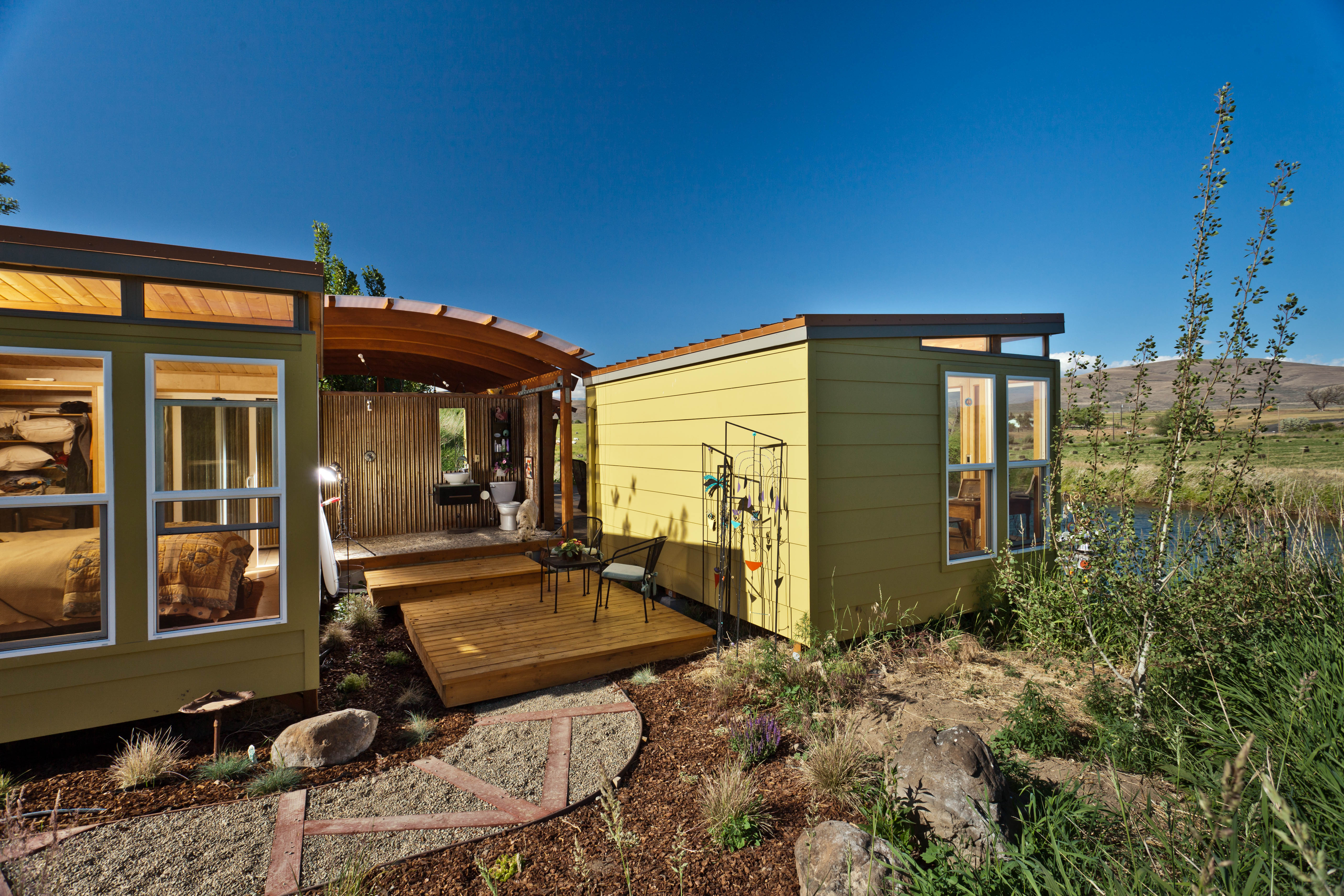 Imagine living completely outdoors. What would you need to live comfortably? How about two Modern-Sheds, an outdoor bathroom, and a covered kitchen and seating area?